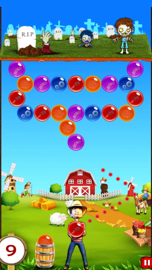 Sam is immersed in an apocalyptic nightmare, stuck in his farm where survival is his only goal. You need to help him make the right choices to stop the outbreak by preventing these “undead” from reaching their vital organs by decapitating them so they won't rise again. How to do it? You need to strategically aim like a sniper, shoot and pair similar bubbles together to destroy them. And just like other shooting games, the trick is to chain combos by utilizing power-ups, and special attacks wisely. Burst higher bubbles to drop lower bubbles from the mass.